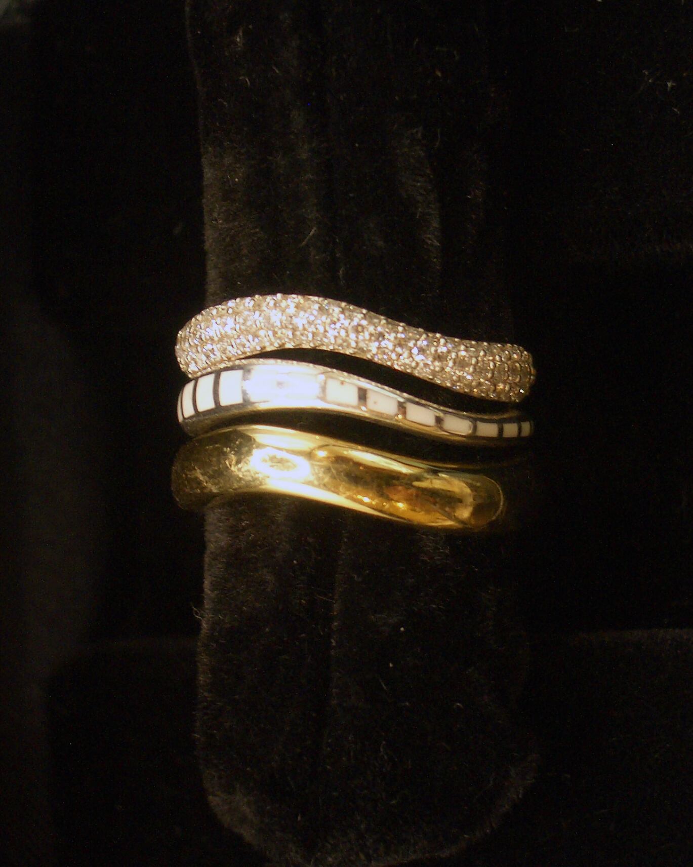 Oshibikimon Ringシリーズは、文様から着想を得たフォルムがスタッキングできるように計算されており、シリーズ商品の組み合わせ次第で多様な表情をお楽しみいただけます。