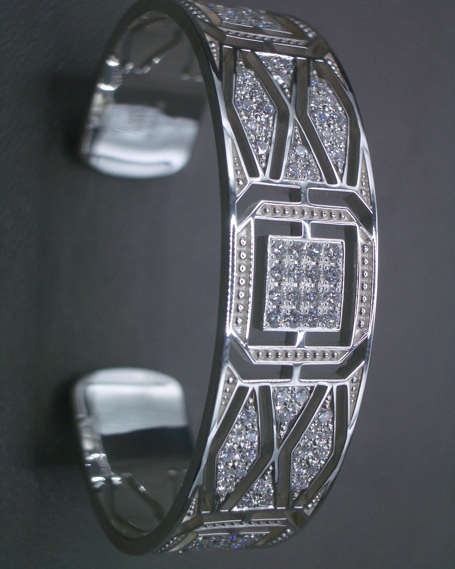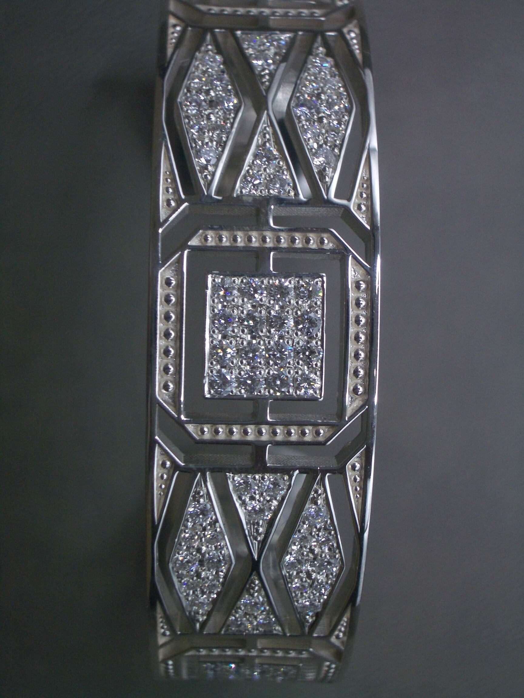 石だたみのように規則正しく並ぶラインの中に、ダイヤモンドを敷き詰めた静謐な輝きが宿る一品です。
