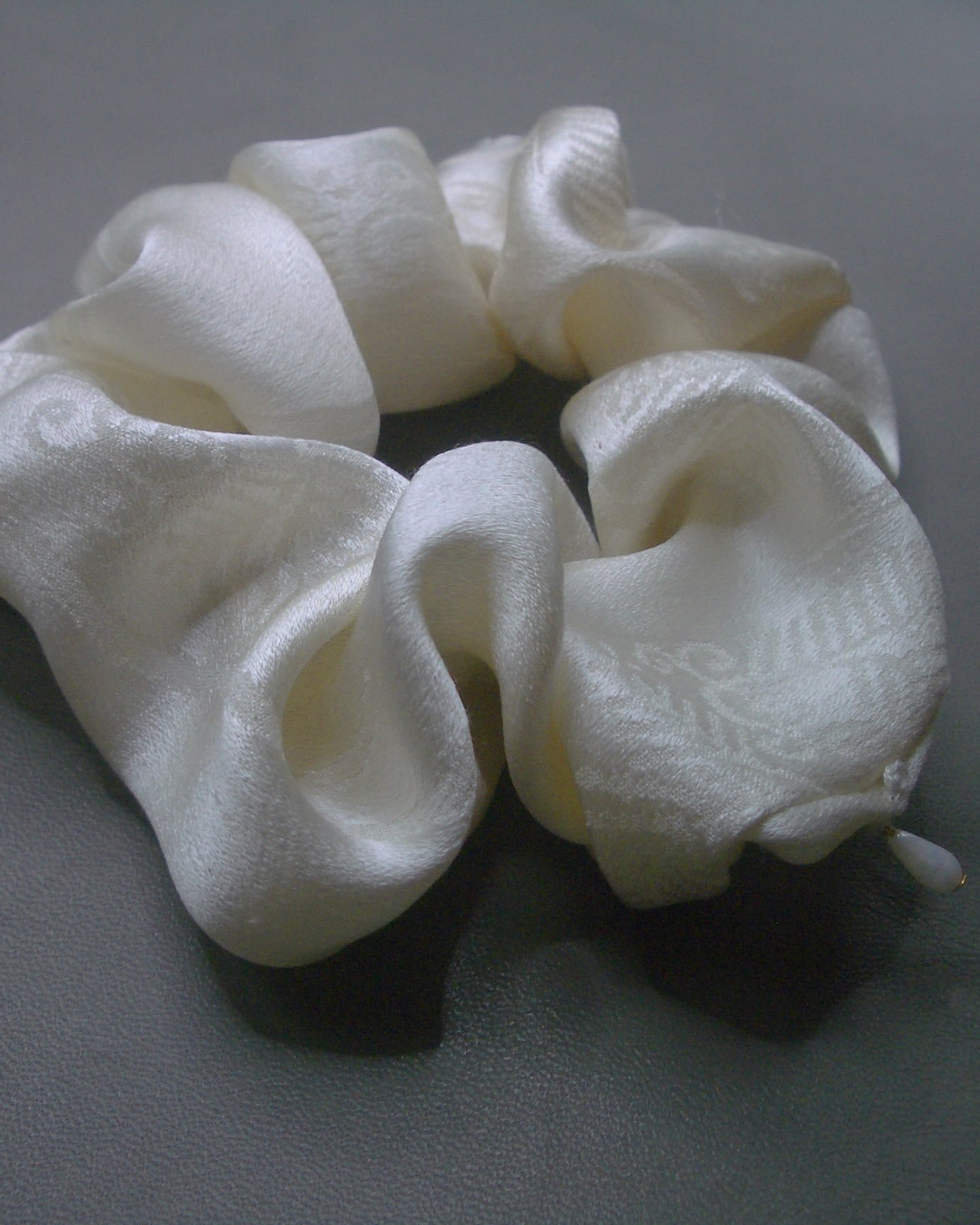 その世界観に静かに寄り添うように生まれた、大正後期~昭和初期のビンテージ着物の端切れを用いたシュシュ。